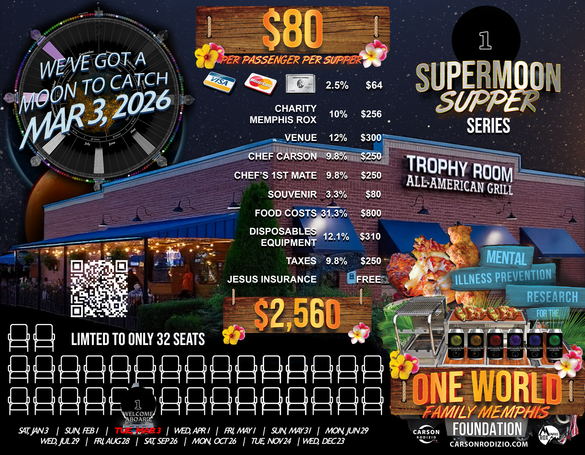 Every seat helps support The One World Family Memphis Foundation, turning food, friendship, and the lunar cycle into a mission of generosity. It’s not just dinner—it’s a movement across 108 moons out, 108 moons back, charting a journey of connection, wonder, and giving.